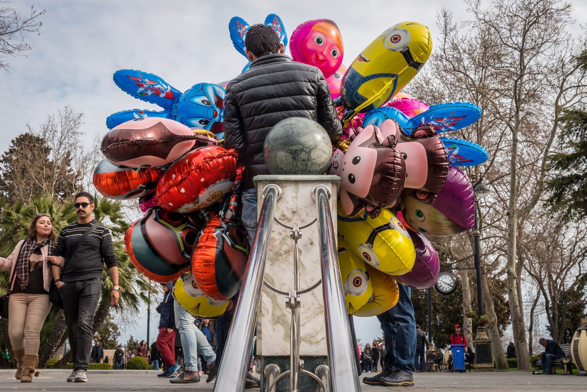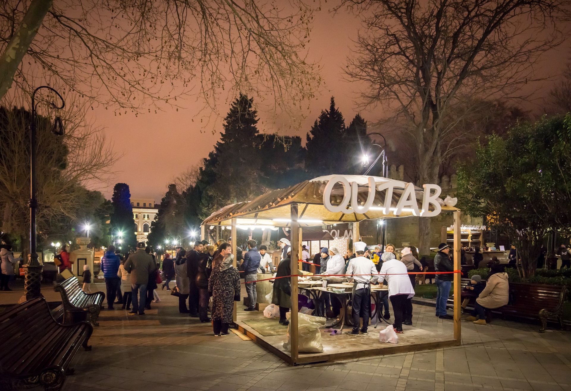 Evening along Baku Boulevard, with locals walking the Caspian Sea promenade under the city skyline.