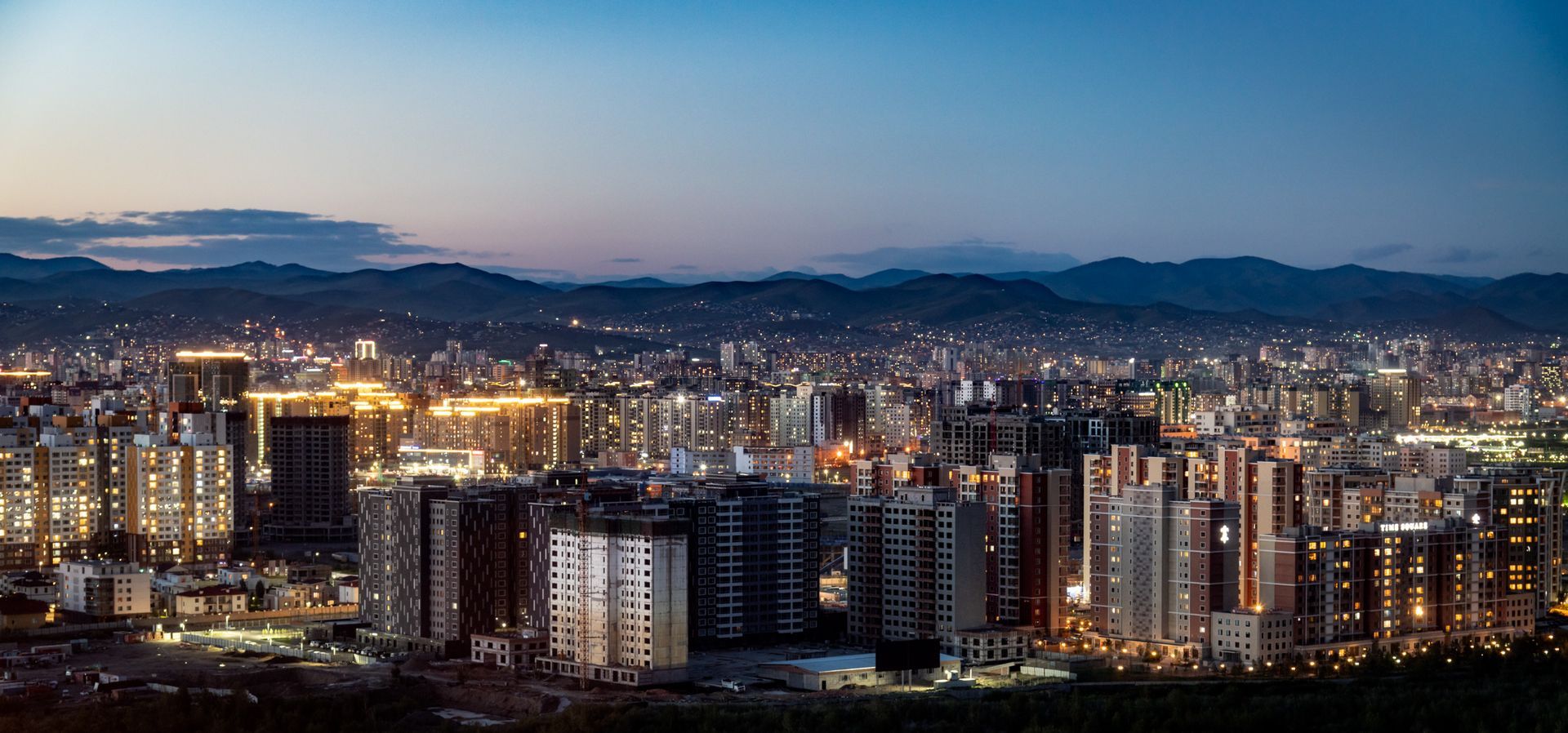Historic Buddhist temple roof stands in contrast with modern glass high-rise in downtown Ulaanbaatar, Mongolia.