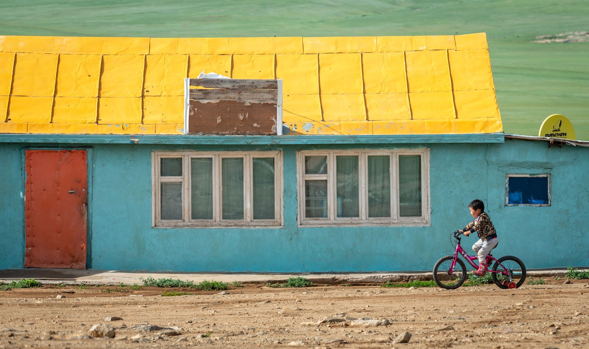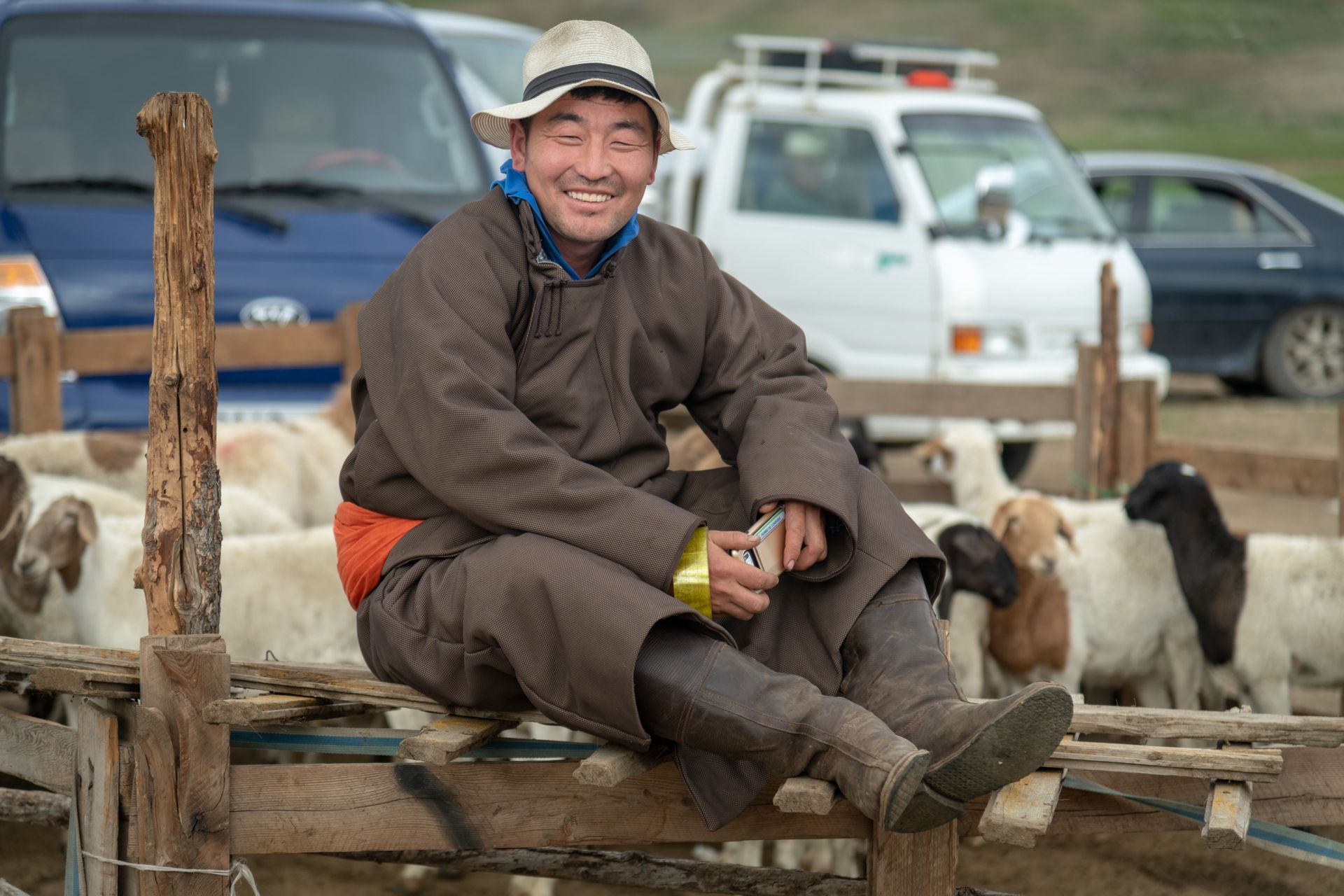 A nomadic Mongolian family lives in a yurt, surrounded by goats and pasture on the open grasslands.